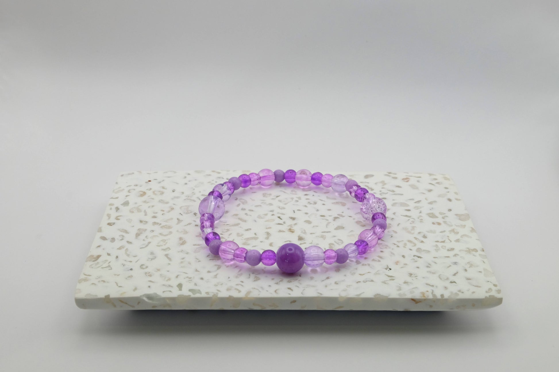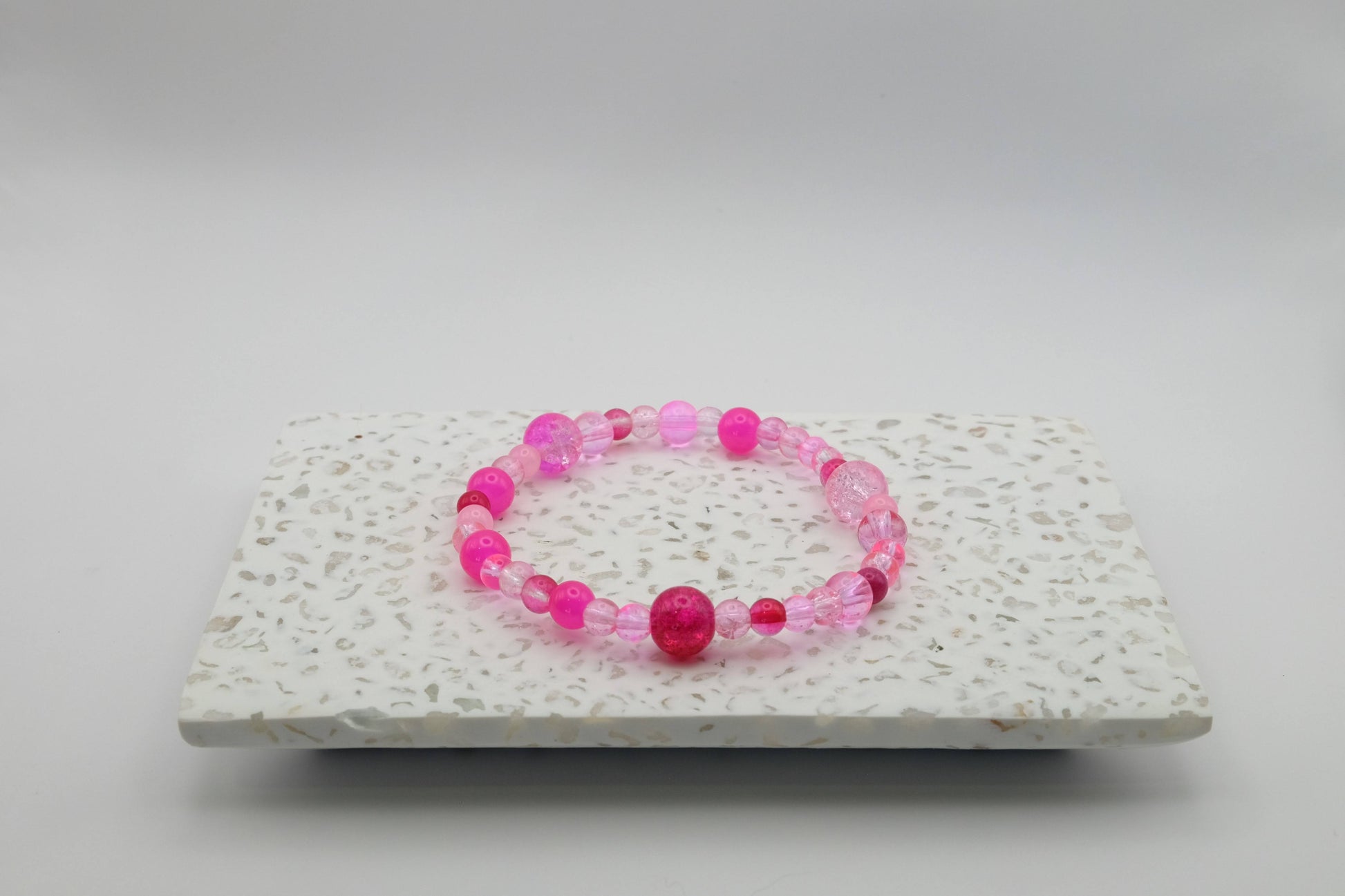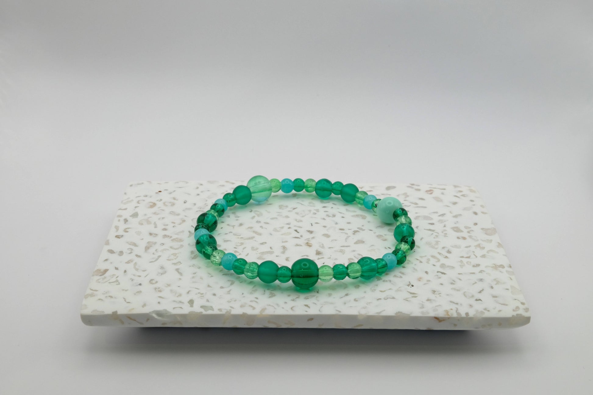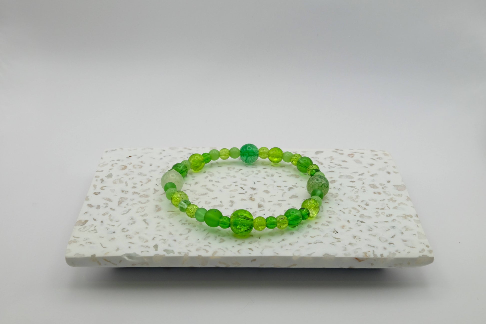 She's a vibrant and eclectic piece that showcases a delightful mix of 4mm, 6mm, and 8mm glass beads in various shades of black, white and crackle green. Each bracelet is a unique creation, ensuring that no two are exactly alike.