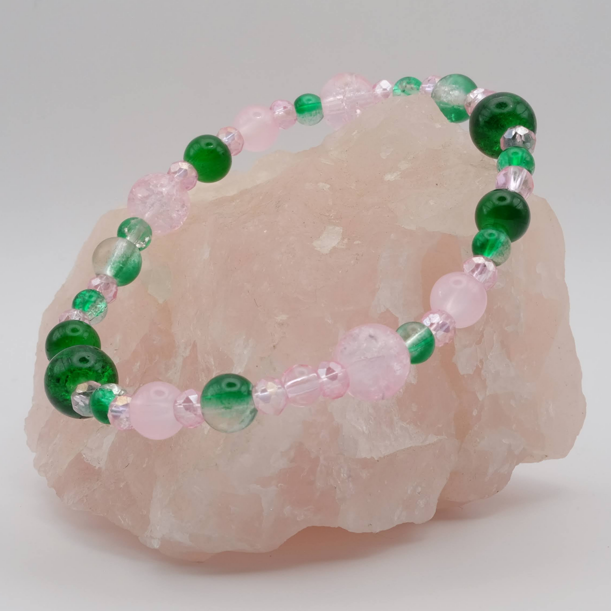 A captivating creation featuring a delicate interplay of 8mm, 6mm, and 4mm round beads entwined with 3mm faceted crystal beads. In this graceful piece, soft pink hues gently mingle with emerald greens, evoking a sense of quiet elegance and subtle magic, as though nature’s prettiest blossoms and lushest leaves have been woven together in a gentle embrace.