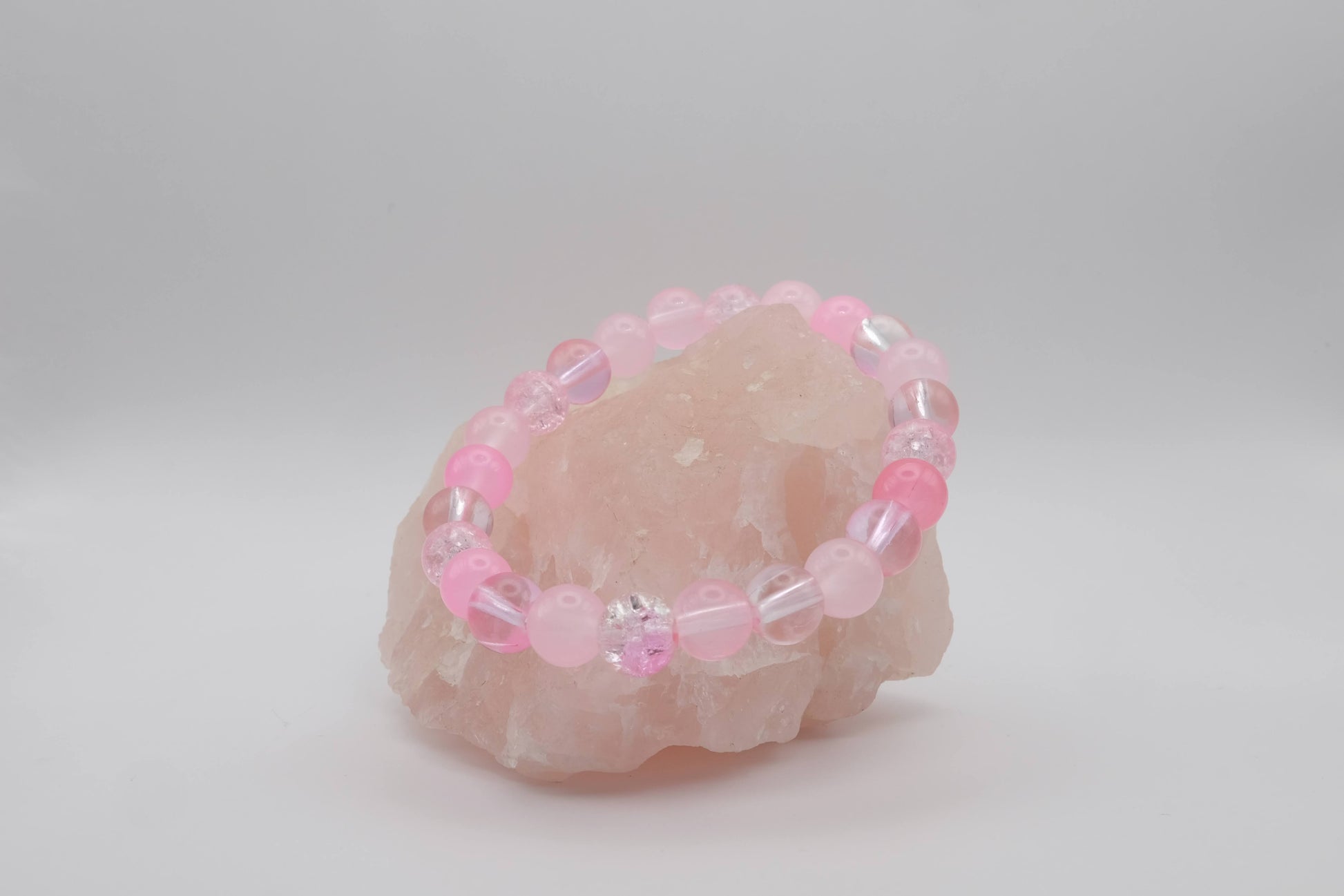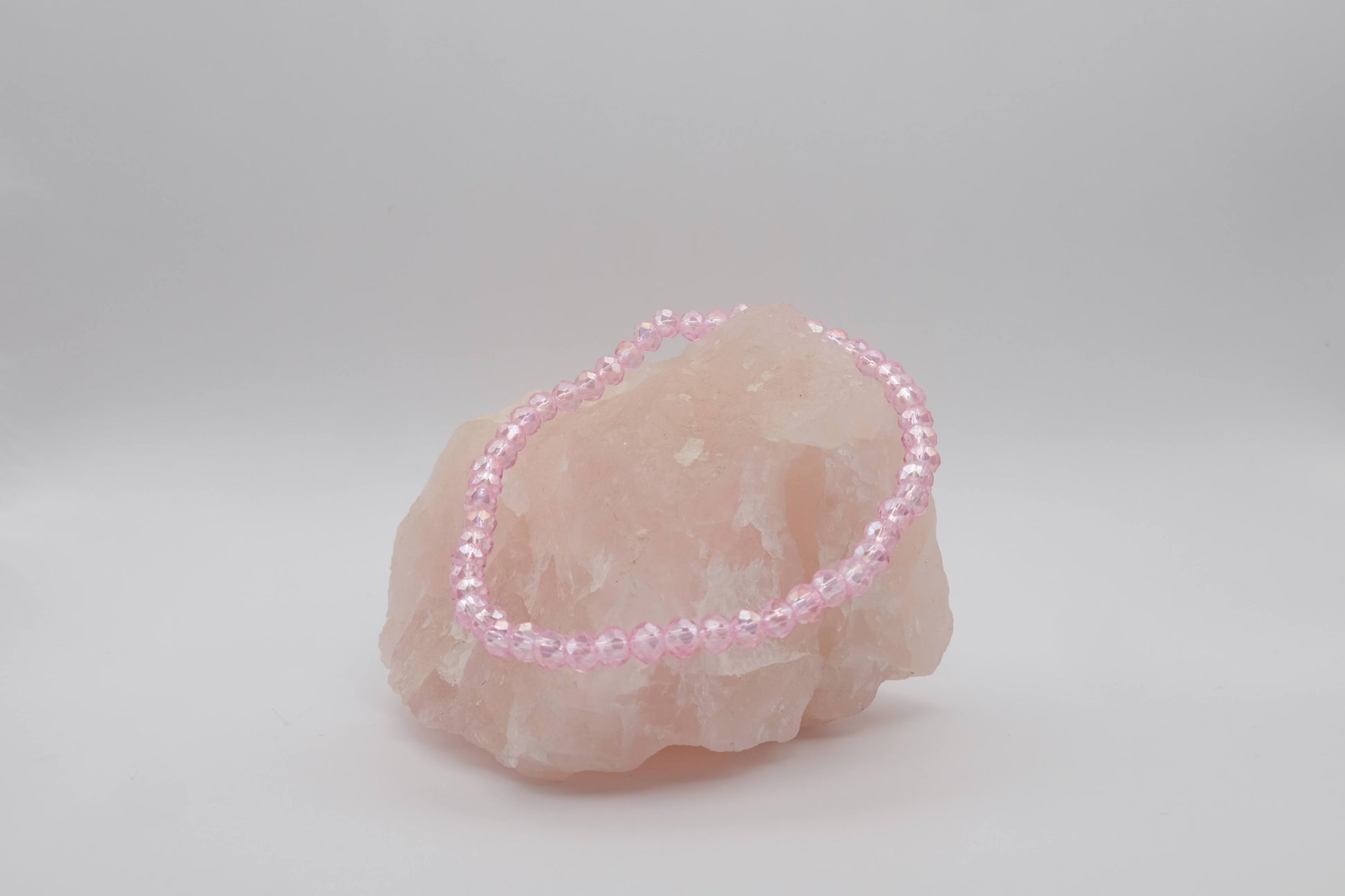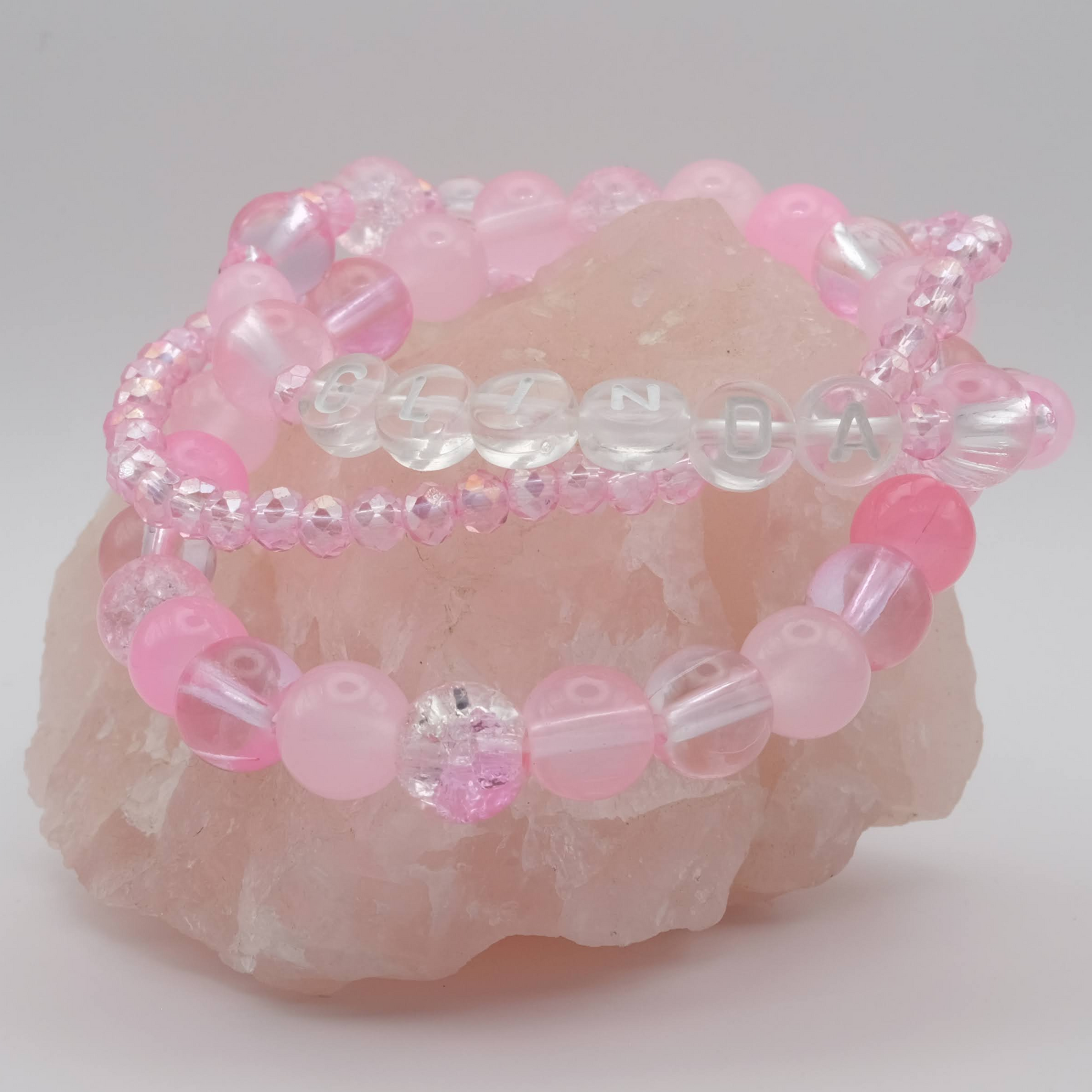 3. Kristin Bracelet: A charming design combining 8mm, 6mm, and 4mm round beads with 3mm faceted crystal beads, all in varying shades of light pink. Adorned with the name "GLINDA" spelled out in clear with white letters round alphabet beads, this bracelet celebrates the inspiration behind this enchanting stack.