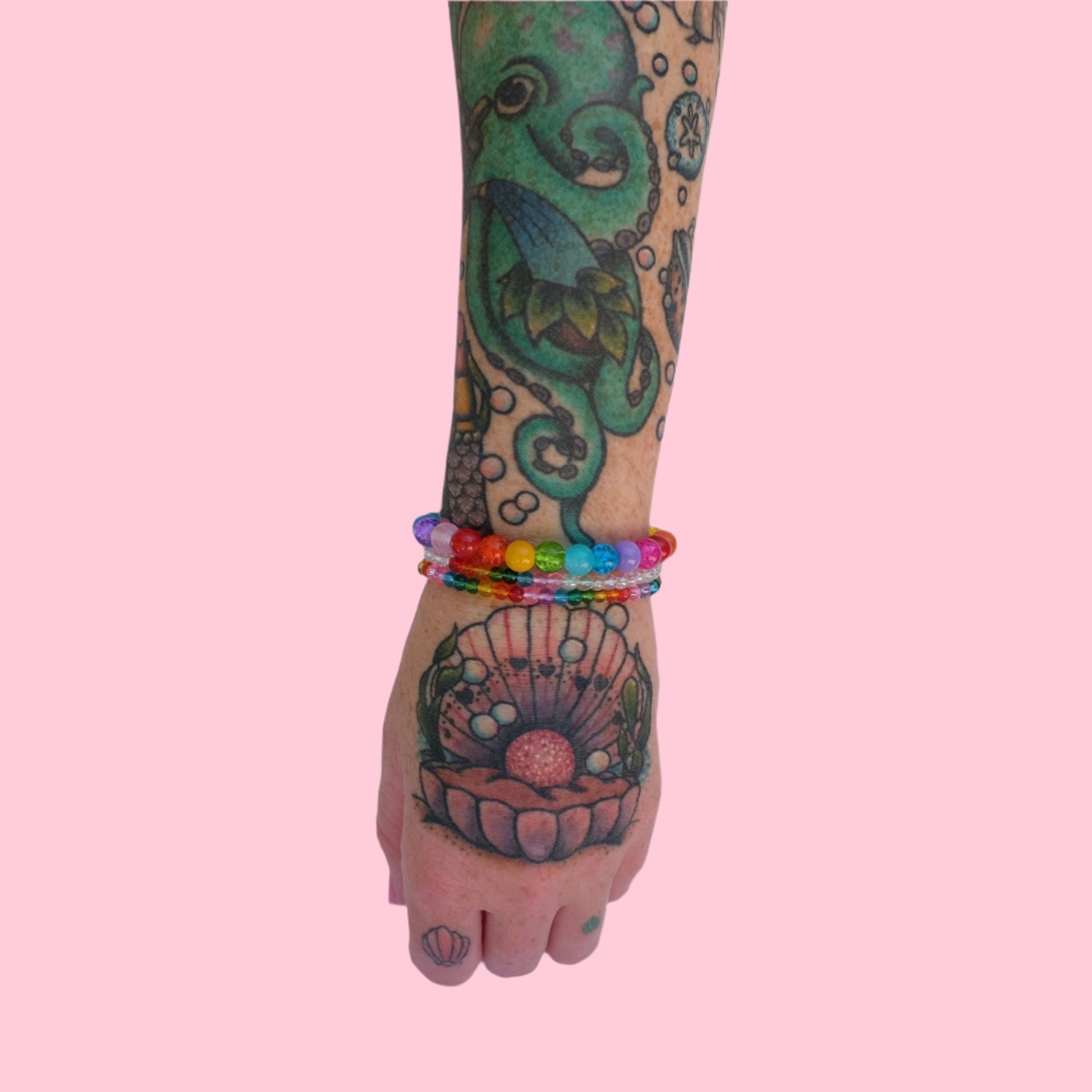 2. Stella Bracelet: (Glass colourway): Featuring 4mm translucent glass beads accented by eight colourful beads in red, orange, yellow, green, aqua, blue, purple, and pink.
