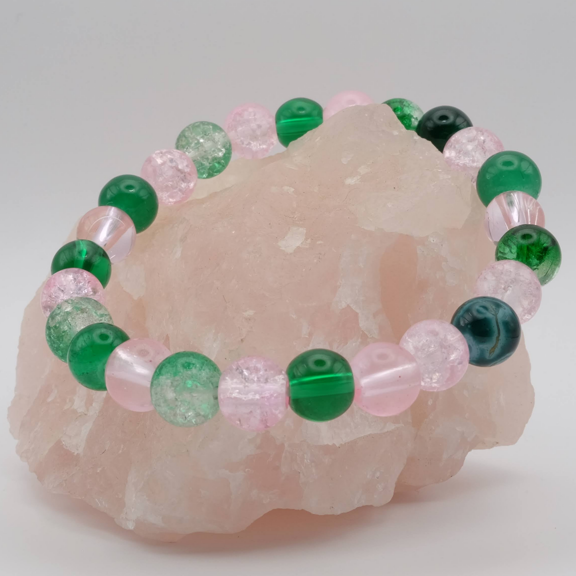 A Wicked twist on the Bessie design, this bracelet is crafted entirely from 8mm glass beads, featuring a beautiful mix of emerald green and soft pinks in various finishes - including solid, frosted, and crackle.