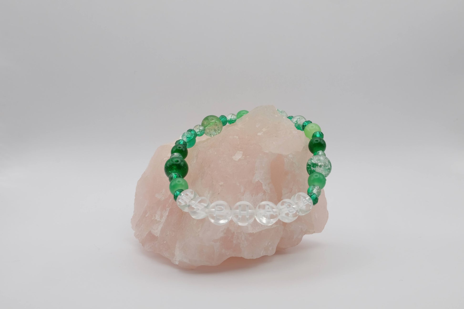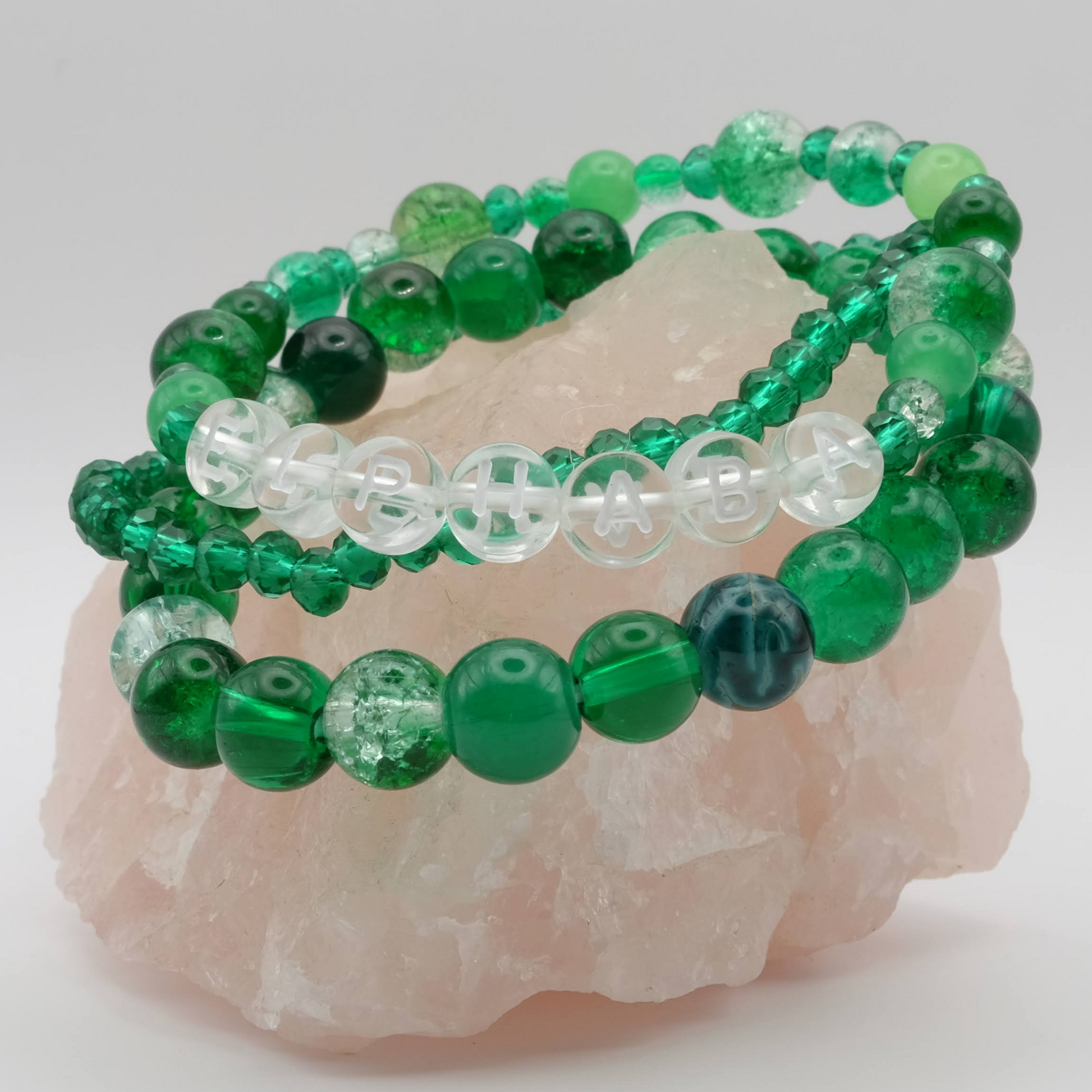 3. Idina Bracelet: A striking design combining 8mm, 6mm, and 4mm round beads with 3mm faceted crystal beads, all predominantly in shades of emerald green. Adorned with the name "ELPHABA" spelled out in clear with white letters round alphabet beads.